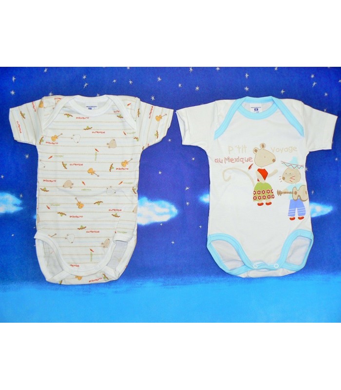 Pack de dos bodis en fantasía Petit Voyage de la marca Abanderado. Apertura inferior, 100% algodón y tallas: