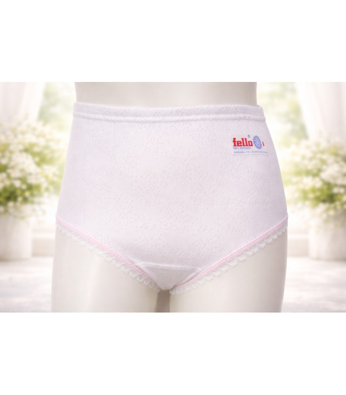 Braguita clásica de niña calada imperio fabricada por Géneros de Punto Fello. La prenda es 100% algodón y destaca por su excelente acabado, suavidad y resistencia. Cada braguita posee su propio certificado de garantía como producto original fabricado en España y de gran calidad.