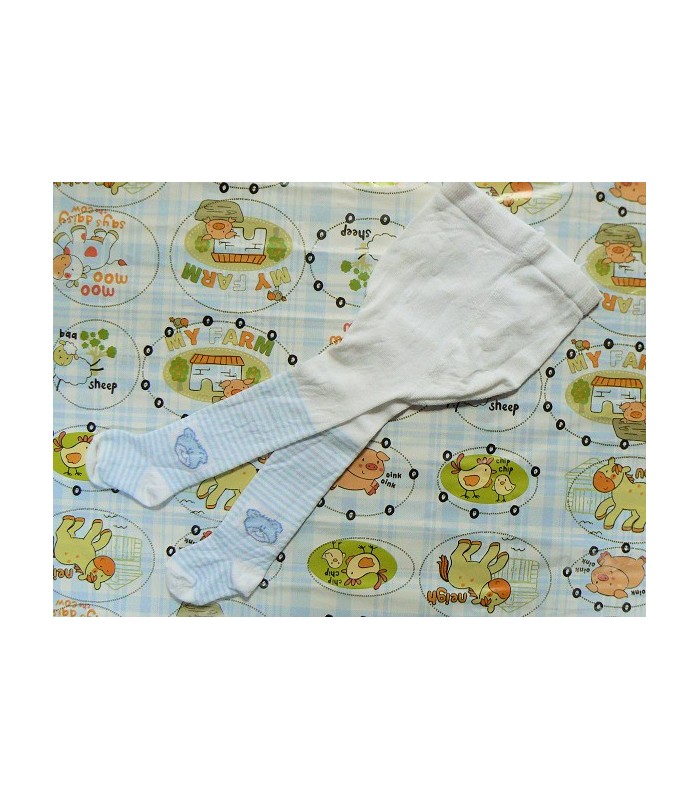Leotardos de la marca Pocholo con dibujo en rayas y ositos de grosor ligero, perfecto para Primavera u Otoño. Los leotardos vienen en su correspondiente caja, disponibles en los colores blanco/ verde y blanco/azul.
