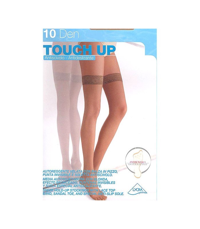 Media autosujetadora con blonda, efecto bronceado, punteras invisibles y suela especial antideslizante. Densidad 10 deniers y talla única.